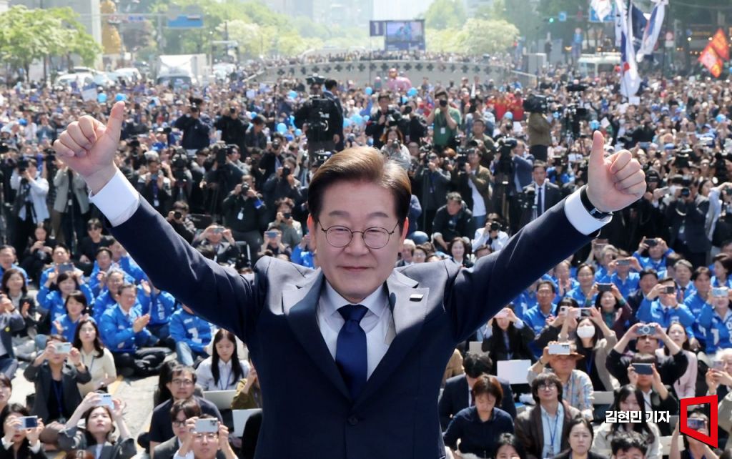 이재명 더불어민주당 대선후보가 제21대 대통령선거 공식 선거운동이 시작된 12일 서울 청계광장에서 열린 '빛의 혁명' 광화문 유세에서 손을 들어 유권자들에게 인사하고 있다.