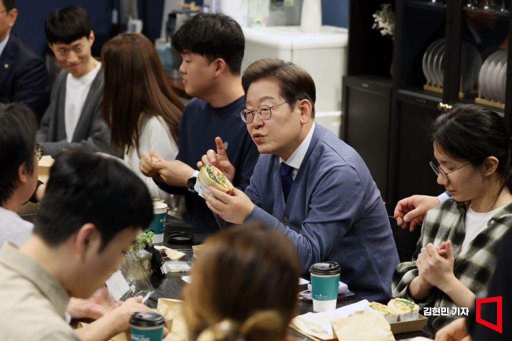 이재명 더불어민주당 대선 후보가 12일 경기 성남시 판교의 한 오피스텔에서 'K-혁신' 브라운백미팅에 참여해 판교 IT개발자 2030 직장인들과 간담회를 하고 있다. 김현민 기자