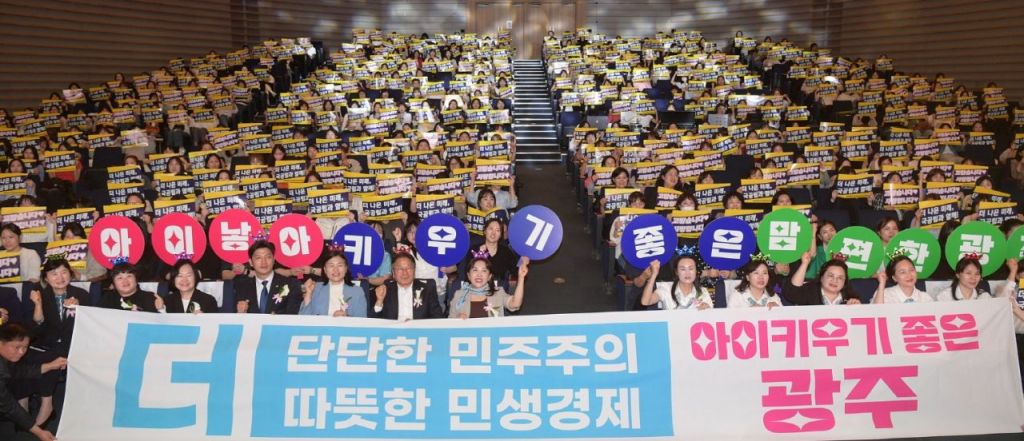 강기정 광주시장이 12일 오후 시청 대회의실에서 열린 스승의 날 기념 국공립어린이집연합회 교직원 힐링 콘서트에 참석, 축사 후 참석자들과 함께 저출산 극복 릴레이 캠페인을 하고 있다. 광주시 제공