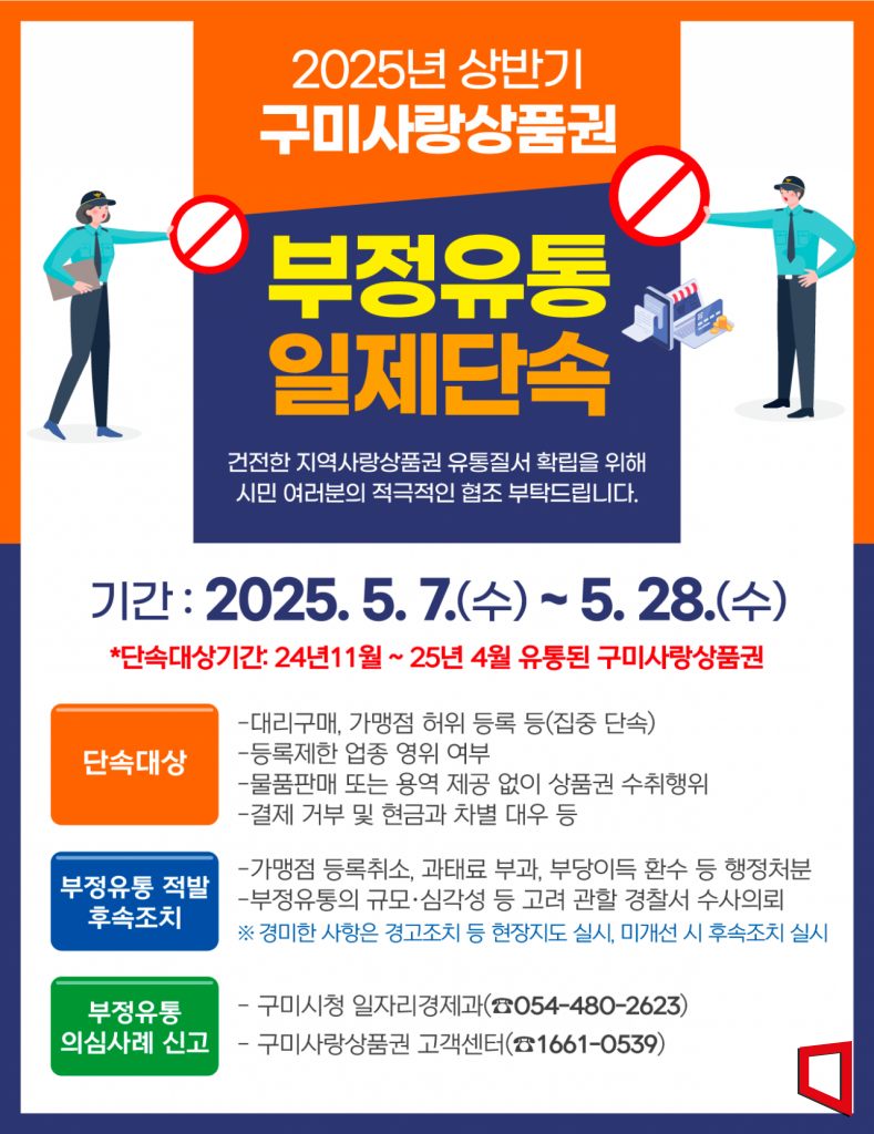 경북 구미시가 구미사랑상품권 부정유통 멈춰!…구미시 일제단속 실시 안내 홍보 포스터