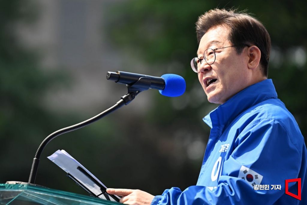 이재명 더불어민주당 대선후보가 제21대 대통령선거 공식 선거운동이 시작된 12일 서울 청계광장에서 열린 '빛의 혁명' 광화문 유세에서 연설하고 있다. 김현민 기자