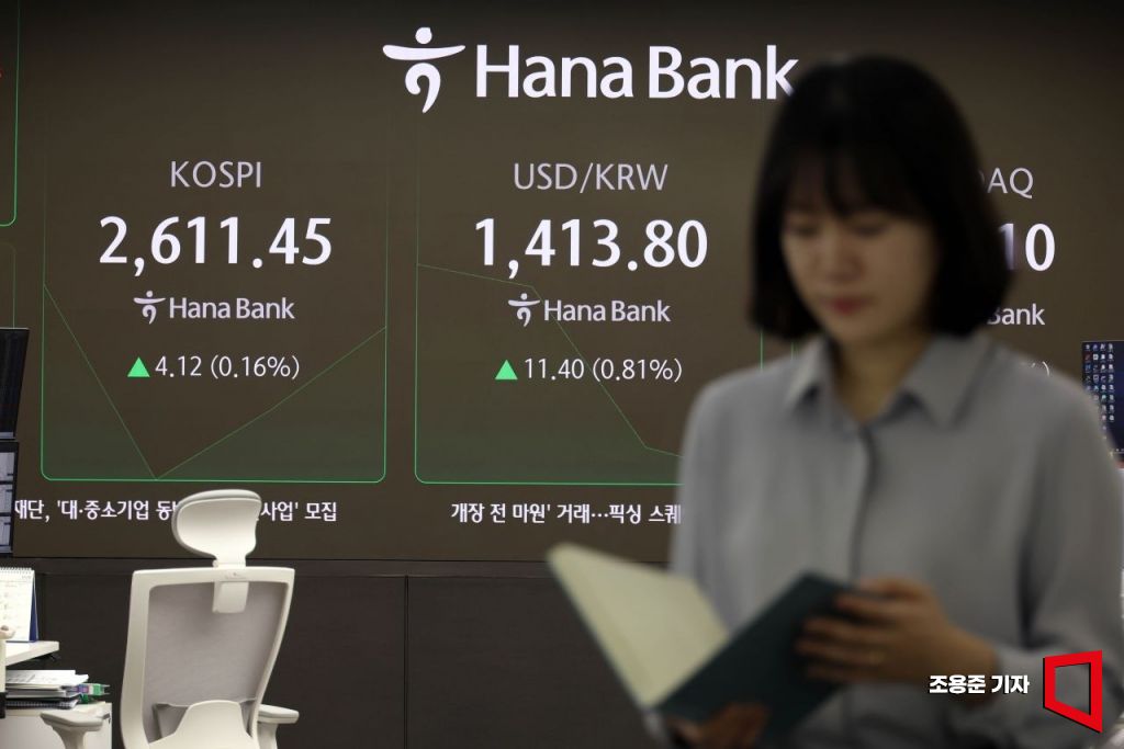 미중 상호관세 합의에 미국 뉴욕 증시가 일제히 급등 소식에도 코스피는 약보합으로 출발한 13일 서울 중구 하나은행 본점 딜링룸 현황판에 코스피와 원/달러 환율 등이 표시돼 있다. 이날 코스피는 전장보다 1.83포인트 오른 2,609.16으로 원/달러 환율은 12.6원 오른 1415.0원 장을 시작했다.