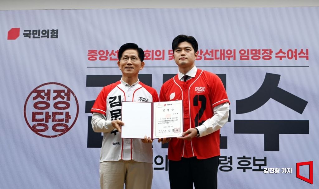 김문수 국민의힘 대선 후보가 12일 오전 서울 영등포구 여의도 국민의힘 중앙당사에서 열린 중앙선대위 임명장 수여식에서 김용태 의원에게 임명장을 수여한 뒤 기념사진을 찍고 있다. 강진형 기자