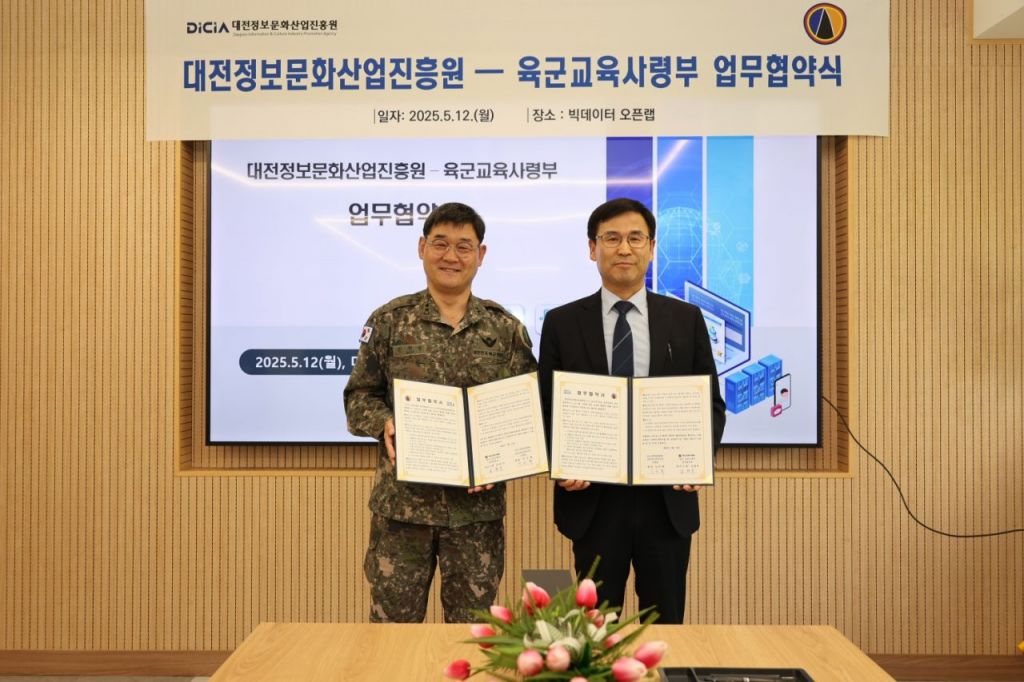대전정보문화산업진흥원은 지난 12일 오후 충남대 빅데이터 오픈랩에서 육군교육사령부와 'AI 및 데이터 교육 및 정보공유 강화를 위한 업무협약(MOU)'을 체결했다고 밝혔다.