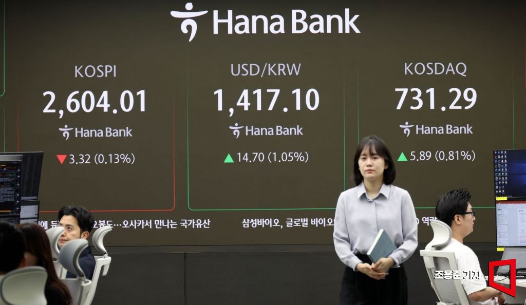 미중 상호관세 합의에 미국 뉴욕 증시가 일제히 급등 소식에도 코스피는 약보합으로 출발한 13일 서울 중구 하나은행 본점 딜링룸 현황판에 코스피와 원/달러 환율 등이 표시돼 있다. 이날 코스피는 전장보다 1.83포인트 오른 2609.16으로 원/달러 환율은 12.6원 오른 1415.0원 장을 시작했다. 조용준 기자