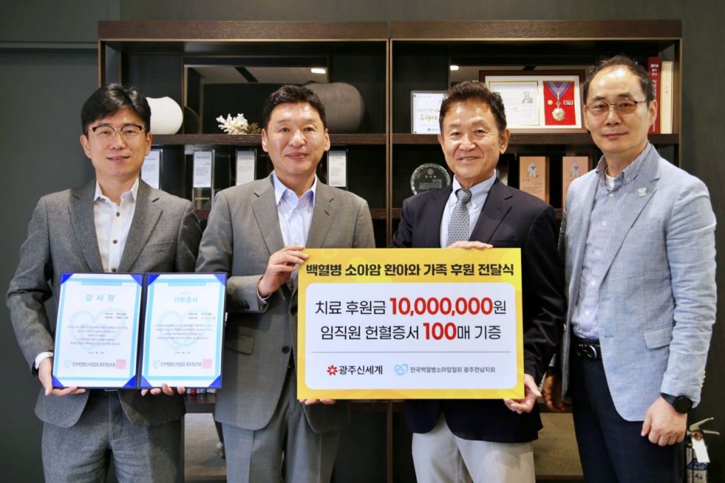 이동훈 광주신세계 대표이사는 "백혈병 등으로 고통받는 환아들에게 희망을 전하고자 후원금과 헌혈증서를 기부하게 됐다"며 "환아 가족들이 하루빨리 건강한 일상으로 돌아오시기를 기원하겠다"고 말했다.