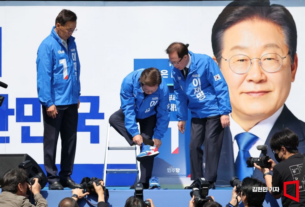 이재명 더불어민주당 대선 후보가 12일 서울 청계광장에서 열린 출정식 및 첫 유세에서 운동화로 갈아신고 있다. 김현민 기자