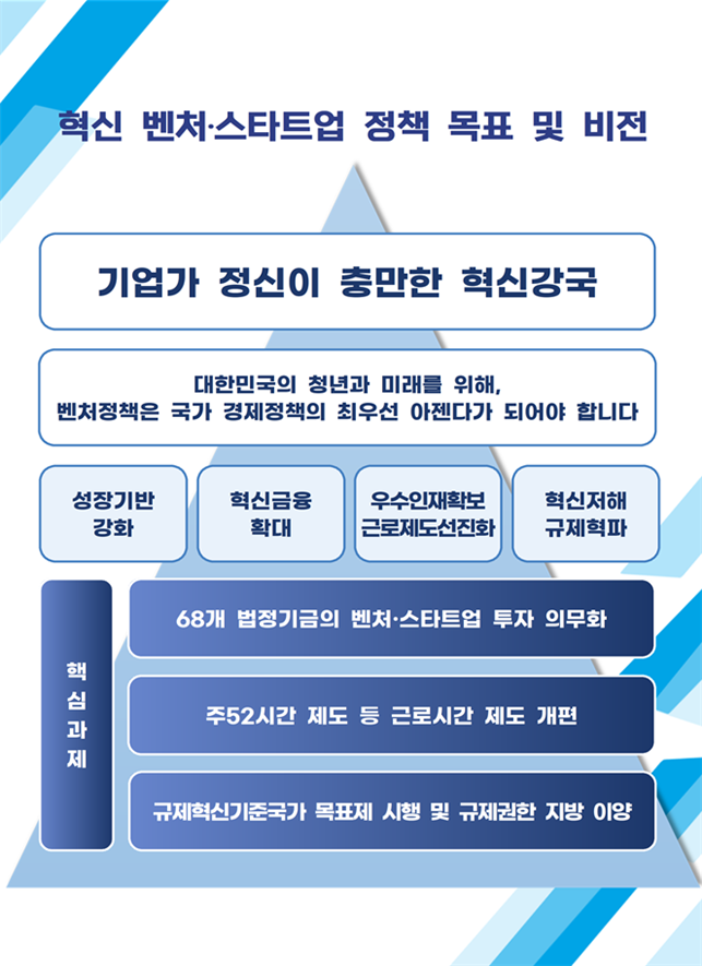 혁신 강국 실현을 위한 3대 핵심 추진과제로 ▲68개 법정기금의 벤처·스타트업 투자 의무화 ▲주52시간제도 등 근로시간 제도 개편 ▲규제혁신기준국가 목표제 및 산업규제 권한의 지자체 이양을 제안했다.