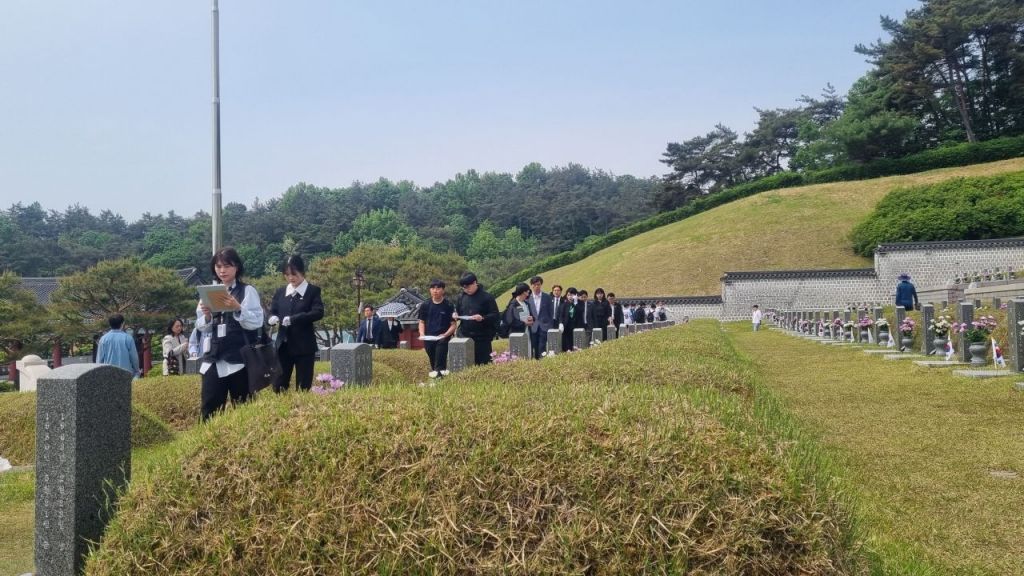 13일 오전 광주 북구 운정동 국립5·18민주묘지에서 광산중학교 1학년 학생들이 열사들의 묘역을 둘러보며 설명을 듣고 있다. 민찬기 기자