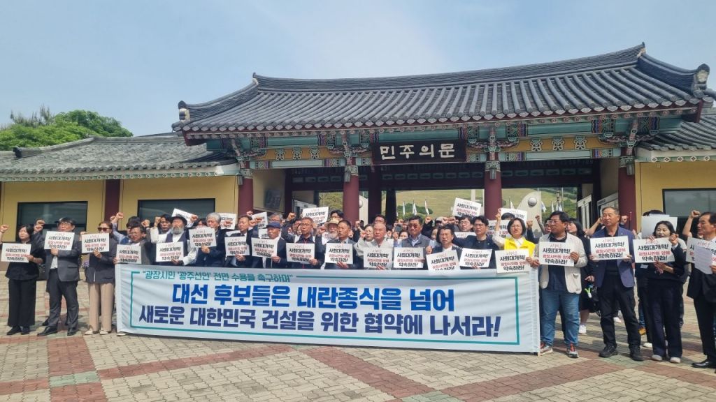 광주 시민사회단체가 제21대 대통령 선거를 앞두고 더불어민주당 이재명 대선 후보에게 내란 종식과 새로운 대한민국 건설을 위해선 사회 대개혁 요구안을 수용해야 한다고 촉구했다.
