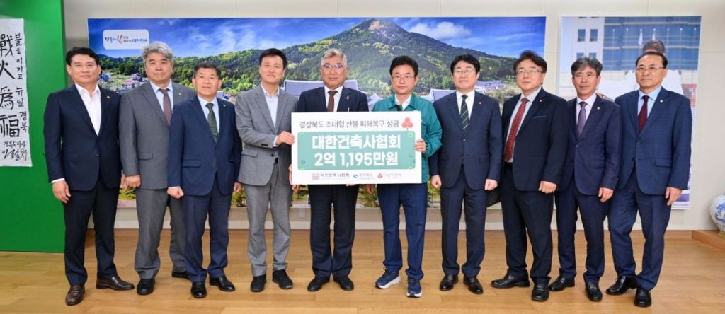 경북 사회복지공동모금회(회장 전우헌, 이하 경북 사랑의열매)는 대한건축사협회(회장 김재록)가 경북 지역 산불 피해 복구를 위해 성금 2억 원을 기부했다고 13일 밝혔다. 지난 9일 경북도청에서 열린 성금 전달식에는 대한건축사협회 김재록 회장, 송동훈 경북건축사회장, 경북 사랑의열매 손병일 사무처장, 이철우 경북도지사 등이 참석했다.