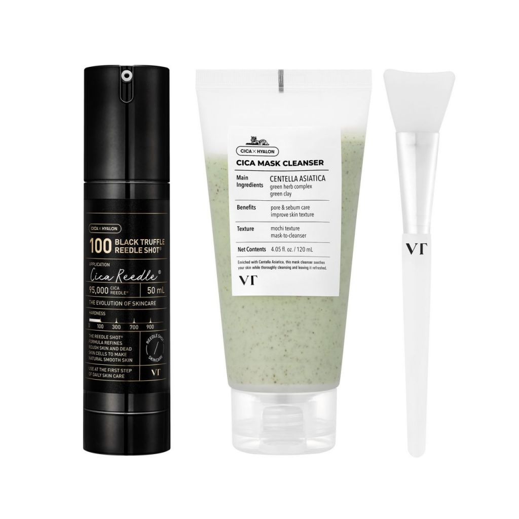 왼쪽부터 신제품 VT 블랙 트러플 리들샷 100, CICA 마스크 클렌저, 전용 브러시. 브이티