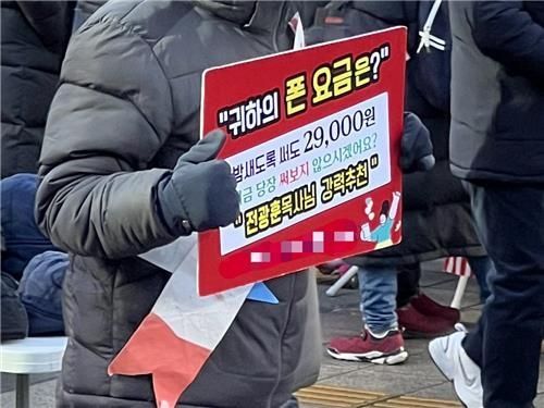 지난 2월 윤석열 전 대통령 탄핵 반대 집회에서 ‘퍼스트모바일’을 판촉하는 모습. 연합뉴스