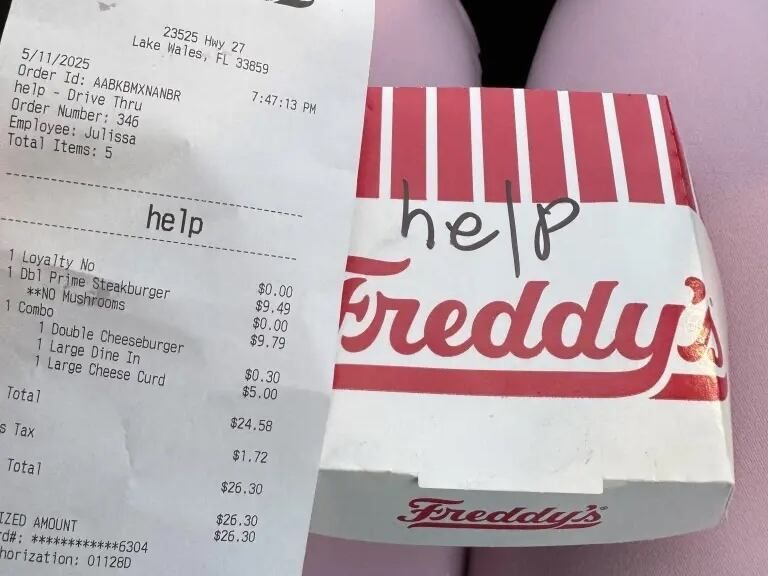 12일(현지시간) 미 '뉴욕포스트'는 최근 온라인 커뮤니티 '레딧'에 올라온 한 사연을 소개했다. 사연의 주인공은 미국 플로리다주 레이크웨일스에 거주하는 A씨로, 그는 최근 플로리다의 패스트푸드점을 방문했다고 한다. 그러나 주문한 햄버거 포장 상자를 받아든 그는 이내 깜짝 놀랐다. 구매 영수증과 상자에 "도와주세요"라는 글자가 적혀 있었기 때문이다.
