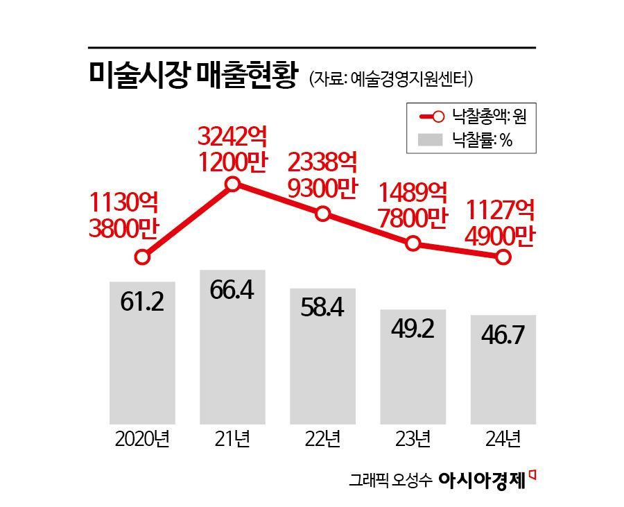 이 같은 불황은 경매 시장에서도 뚜렷하게 나타난다. 19일 예술경영지원센터에 따르면 지난해 국내 주요 10개 경매사의 온·오프라인 미술품 낙찰 총액은 1조1127억원으로 최근 5년간 가장 낮은 수준을 기록했다. 낙찰률은 전년보다 2.5%포인트 하락한 46.7%로, 2021년 호황기 때의 66.4%와 비교하면 크게 떨어졌다. 경매 횟수는 266회로 전년보다 11회 줄었고, 출품작 수는 2만4023점으로 전년 대비 15.9% 감소했다.