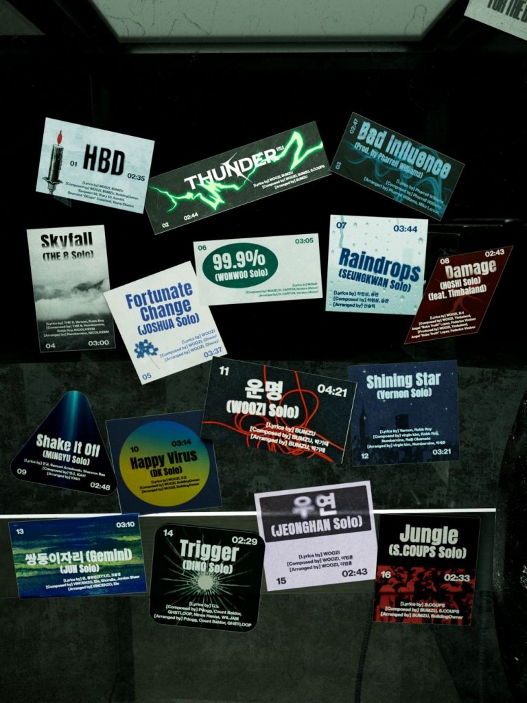 이번 앨범은 단체곡 3곡과 멤버 13명의 솔로곡 등 총 16트랙으로 구성됐다. 타이틀곡 '썬더'는 독보적인 존재로 거듭난 멤버들이 자신만의 세계를 확장해 나가는 모습을 천둥과 번개에 빗대 표현한 곡이다. 우지와 범주가 공동으로 작사·작곡했고, 에스쿱스도 작곡에 참여했다.
