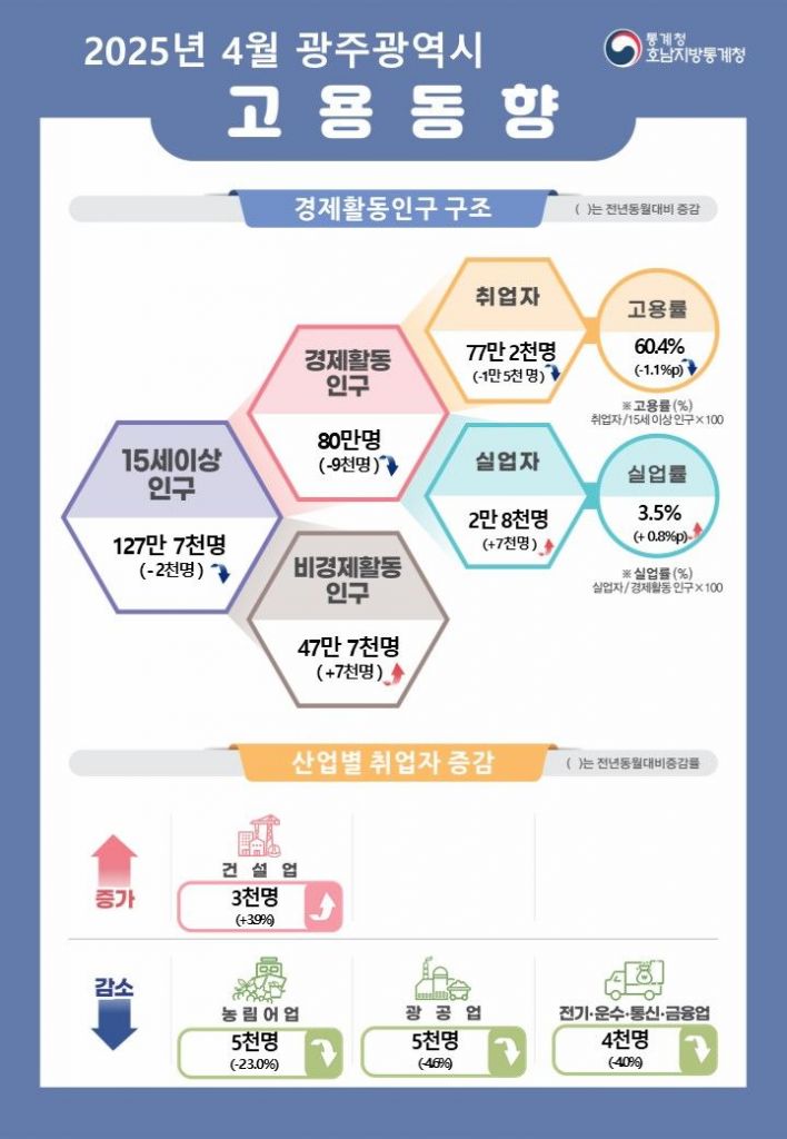 4월 광주와 전남의 고용 지표가 엇갈렸다. 광주는 고용률 하락과 실업률 상승이라는 이중고를 겪었고, 전남은 취업자 수가 줄었음에도 실업률은 낮아지는 모습을 보였다. 여성과 자영업자 중심의 고용 감소가 광주의 특징이라면, 전남은 남성 중심의 고용 회복과 농업 고용 기반의 위축이 동시에 나타났다.