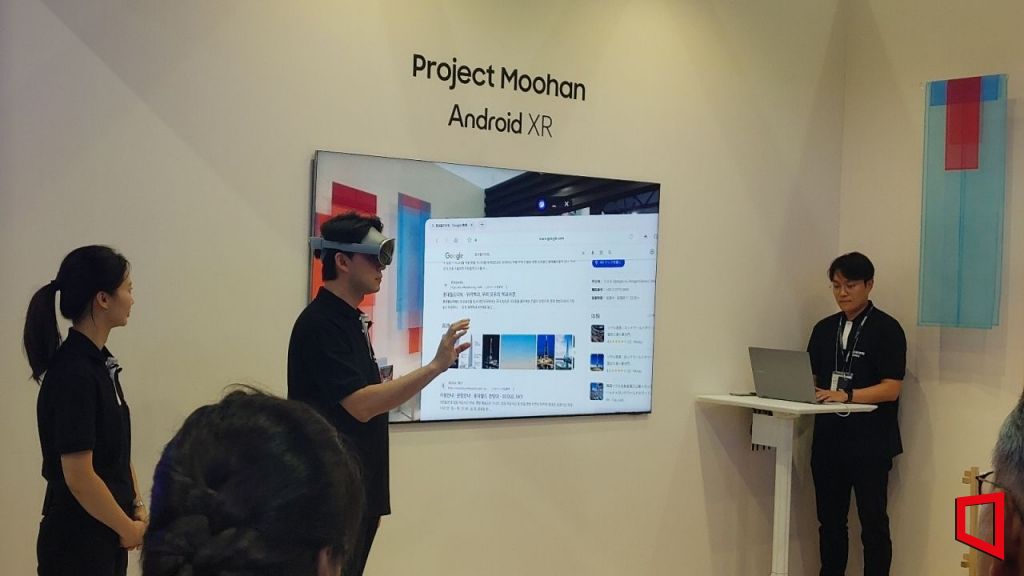 이날 업계와 현지 관계자들에 따르면, 삼성전자는 일본 오사카엑스포가 열리고 있는 유메시마 전시장 내에 마련된 '한국우수상품전' 팝업스토어에서 XR 기기 프로젝트 무한을 시연한다. 프로젝트 무한은 삼성전자가 구글, 퀄컴과 손잡고 개발 중인 XR 기기다. 3사가 공동으로 개발한 XR 전용 운영체제(OS) '안드로이드XR'과 구글의 인공지능(AI) 비서 '제미나이'가 탑재됐다. 헤드셋을 착용한 이용자는 자신의 눈앞 렌즈를 통해 펼쳐진 가상공간에서 제미나이와 대화하며 필요한 정보를 수집할 수 있다. 전날 우리 정부 관계자들 앞에서 진행된 사전 공개행사에선 시연에 나선 직원이 XR 헤드셋을 착용하고 눈 앞에 펼쳐진 경복궁 경내를 돌아보다 '근정전'의 현판을 발견하고 제미나이에게 "현판의 한자를 읽어줘"라고 하자 제미나이가 "근정전이에요"라고 답했다.