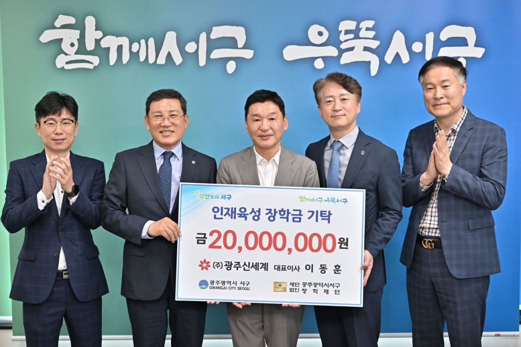 광주 서구(구청장 김이강)는 14일 서구청 구청장실에서 광주신세계(대표이사 이동훈)로부터 인재 육성을 위한 장학금 2000만원을 기탁 받았다. 광주 서구 제공