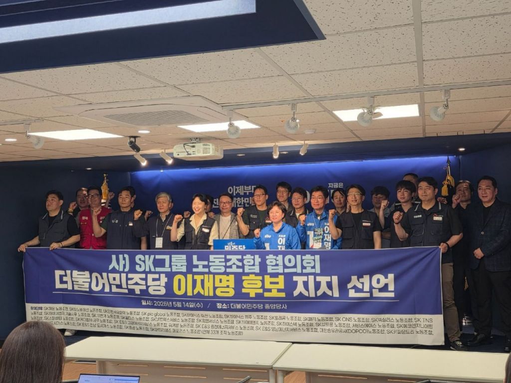 SK그룹 노동조합 협의회가 국내 대기업집단 노조 최초로 대선 후보 공개 지지에 나섰다. 10대 공약의 일환으로 '노동 존중 사회 구현'을 내세운 이재명 더불어민주당 후보 지지를 발표한 것인데, 추후 노동계의 움직임에도 이목이 쏠린다.
