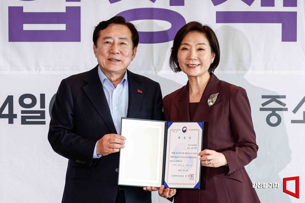 김기문 중소기업중앙회장이 14일 서울 여의도 CCMM빌딩에서 열린 '2025년 제1차 중소기업정책심의회'에 참석해 오영주 중소벤처기업부 장관에게 중소기업정책심의회 위원 위촉장을 전달 받은 뒤 사진촬영 하고 있다.