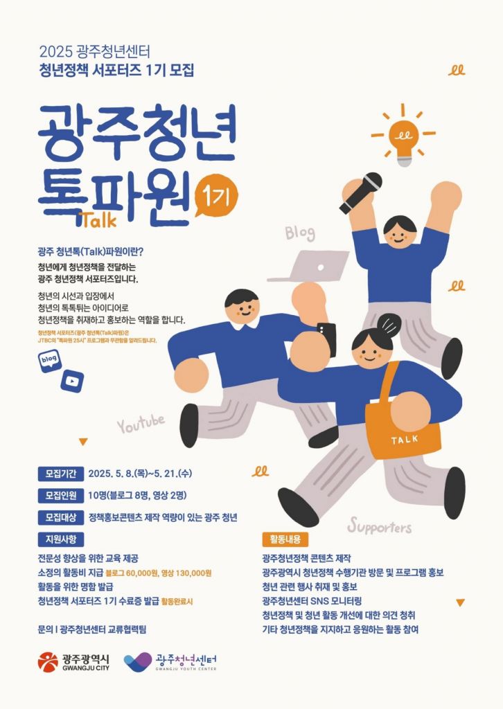 광주시는 광주 청년정책을 청년 눈높이에 맞게 알리기 위해 청년정책 서포터즈인 '광주청년톡파원'을 운영하고, 오는 21일까지 참여자를 모집한다고 14일 밝혔다.