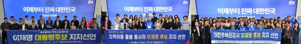 광주지역 산업·복지·주거 등 각 분야 대표 직능단체들이 지난 13일 더불어민주당 이재명 대통령 후보 지지를 공식 선언했다. 사진 왼쪽부터 광주대표산업협의회, 서구지역 아동돌봄 종사자, 대한주택관리사협회 광주시회. 더불어민주당 광주선거대책위 제공