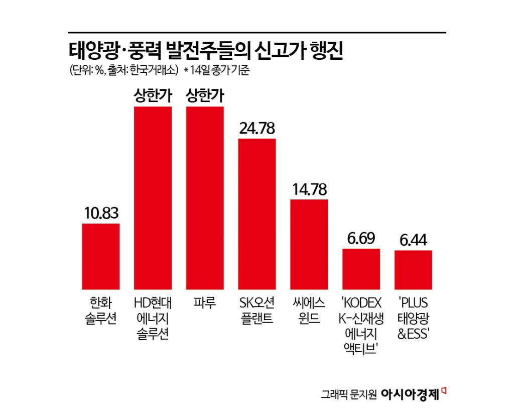 15일 금융투자업계에 따르면 한화솔루션(10.83%), HD현대에너지솔루션(상한가), 파루(상한가) 등 태양광 관련 주들은 전날 일제히 52주 신고가를 경신했다. SK오션플랜트(24.78%), 씨에스윈드(14.78%) 등 풍력 발전주들은 물론 'KODEX K-신재생에너지액티브' ''와 같은 관련 상장지수펀드(ETF)들도 6%대 급등하며 수익률 톱5에 이름을 올렸다.