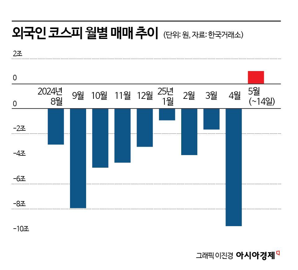 앞서 외국인은 지난해 8월부터 9개월 연속 순매도를 지속했다. 특히 지난달에는 9조3552억원이나 팔아치웠다.