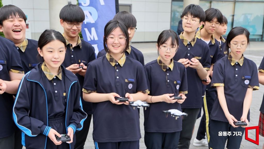 14일 서울 강서구 코엑스 마곡에서 열린 드론산업 얼라이언스 창립총회에 참석한 학생들이 교육용 드론을 날리며 드론 체험을 하고 있다.