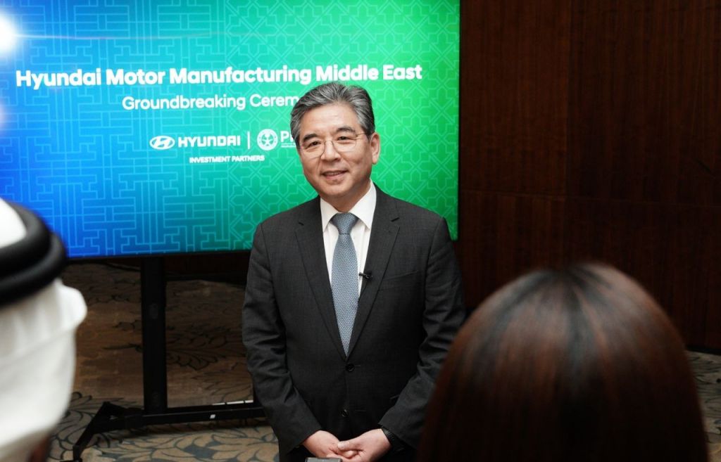 장재훈 현대자동차그룹 부회장이 14일(현지시간) 사우디아라비아 킹 압둘라 경제도시에서 열린 '현대차 사우디 생산법인(HMMME)' 공장 착공식이 끝나고 기자들과 만나 질의응답을 하고 있다. 현대차 제공