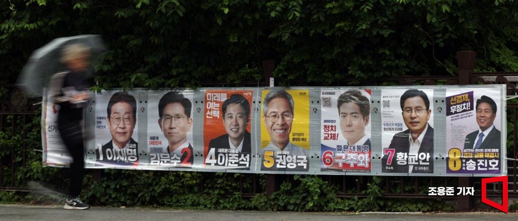 제21대 대통령 선거(6월3일)를 앞둔 15일 서울 강남구 일대에 부착된 대통령선거 후보자들의 선거벽보 앞을 시민이 지나가고 있다.