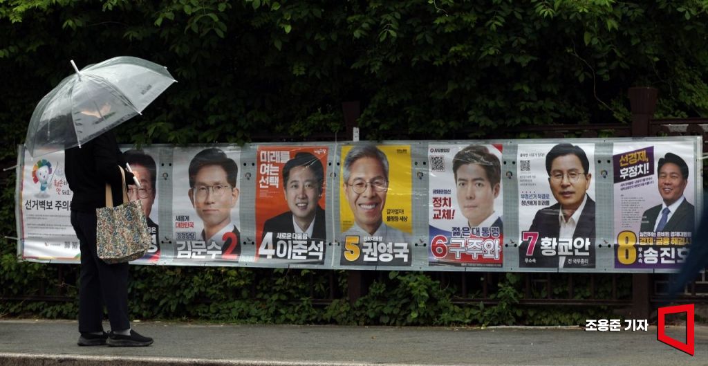 제21대 대통령 선거(6월3일)를 앞둔 15일 서울 강남구 일대에 부착된 대통령선거 후보자들의 선거벽보 앞을 시민이 지나가고 있다.