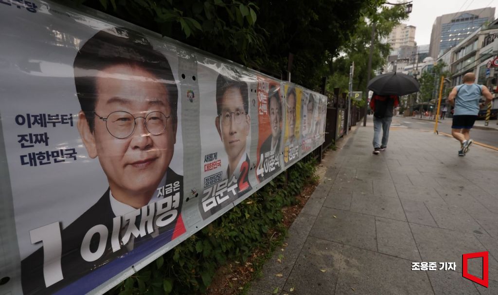 제21대 대통령 선거(6월3일)를 앞둔 15일 서울 강남구 일대에 부착된 대통령선거 후보자들의 선거벽보 앞을 시민이 지나가고 있다.