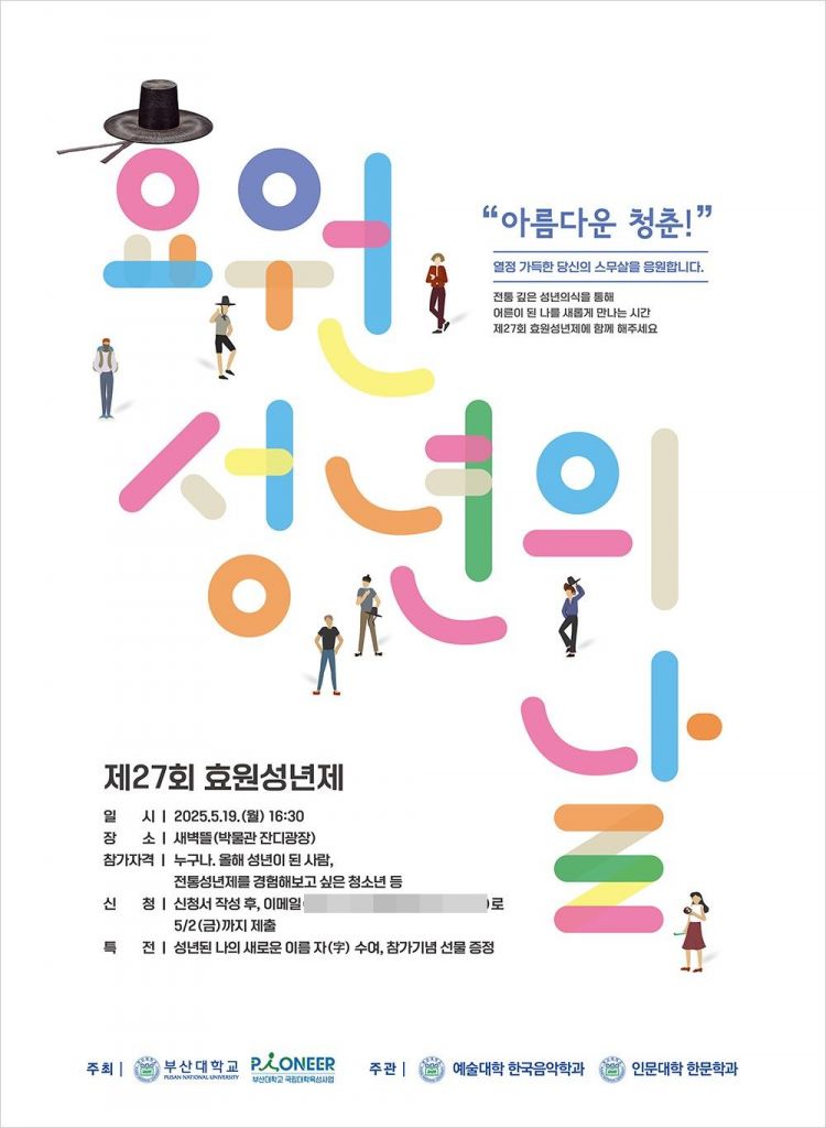 부산대학교(총장 최재원)는 전통 성년례의 현대적 의미를 되새기고 책임감 있는 예비 사회인으로 성장할 수 있도록 오는 19일 오후 4시 30분, 교내 박물관 야외 잔디마당에서 '2025 제27회 효원성년제(曉原成年祭)'를 개최한다.