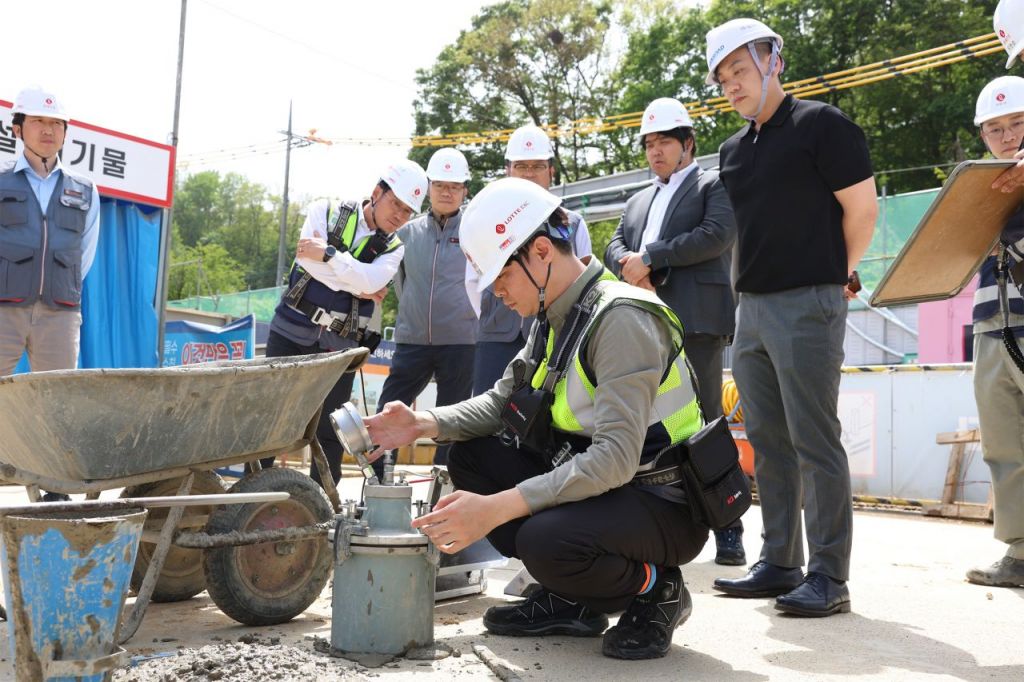 롯데건설 직원이 서울 서초구 헌인마을 현장에서 차세대 혼화제를 적용한 콘크리트를 테스트하고 있다. 롯데건설 제공