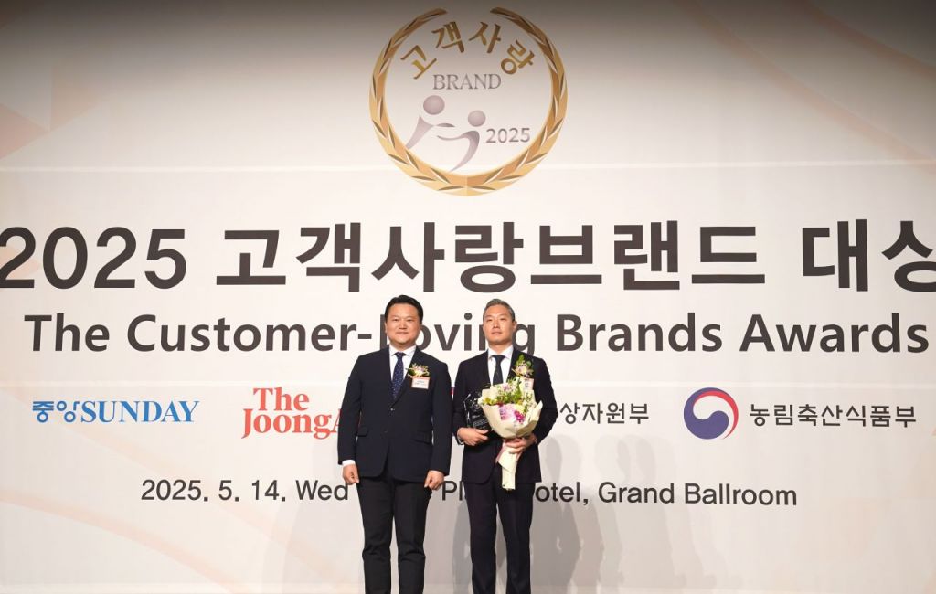 깨끗한나라 마케팅실 하보영 상무(오른쪽)가 2025 고객사랑브랜드대상에서 수상한 뒤 기념사진을 촬영하고 있다. 깨끗한나라 제공