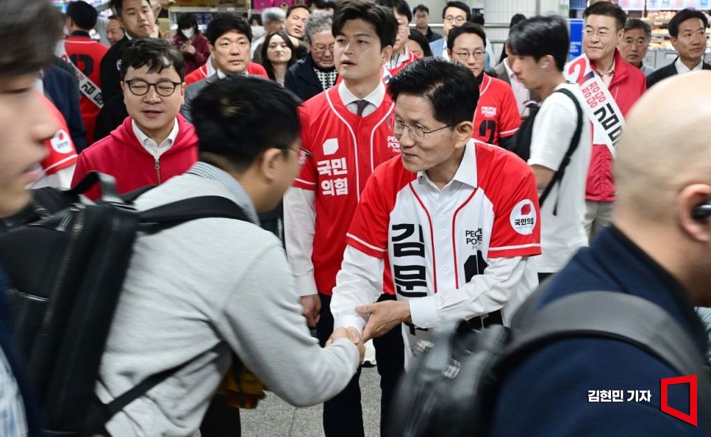 김문수 국민의힘 대선 후보가 15일 서울 구로구 신도림역에서 출근길 시민들과 인사하며 지지를 호소하고 있다.