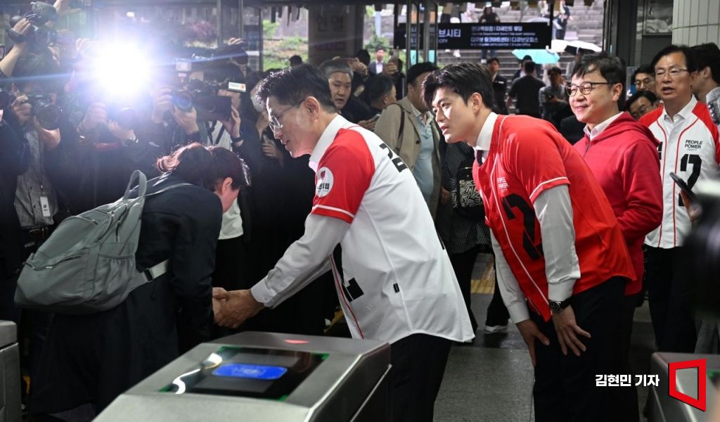 김문수 국민의힘 대선 후보가 15일 서울 구로구 신도림역에서 출근길 시민들과 인사하며 지지를 호소하고 있다.