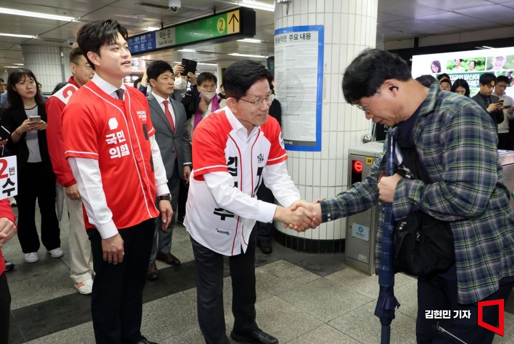 김문수 국민의힘 대선 후보가 15일 서울 구로구 신도림역에서 출근길 시민들과 인사하며 지지를 호소하고 있다.