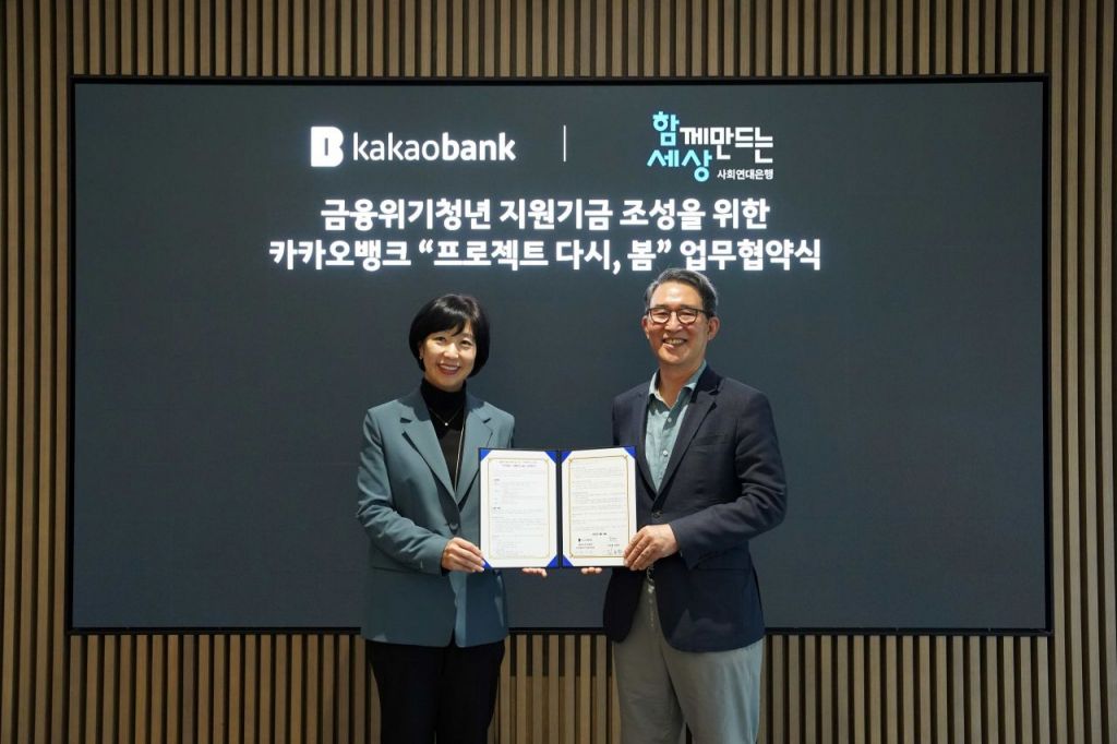 카카오뱅크가 함께만드는세상(사회연대은행)과 '프로젝트 다시, 봄' 업무 협약을 맺고 금융위기 청년 지원 기금 조성을 위한 기부금 10억원을 전달했다.