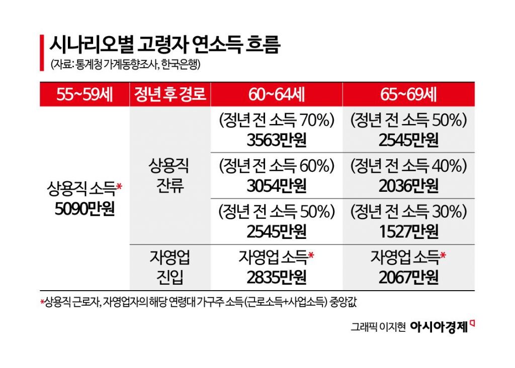 정년 후 60~64세에는 55~59세 상용직 소득의 60%를 벌며 상용직 계속근로를, 65~69세에는 55~59세 상용직 소득의 40%를 벌며 시간제근로를 유지할 경우 소득 흐름이 정년 후 자영업에 진입했을 때와 유사했다는 설명이다. 이 차장은 "자영업 진입 시 전환비용과 초기 창업비용이 크고 소득 변동성도 높아지는 점을 고려하면 고령 은퇴자들은 계속근로가 보장될 경우 이전보다 소득이 낮아지더라도 상용직을 선택할 유인이 크다"고 강조했다.