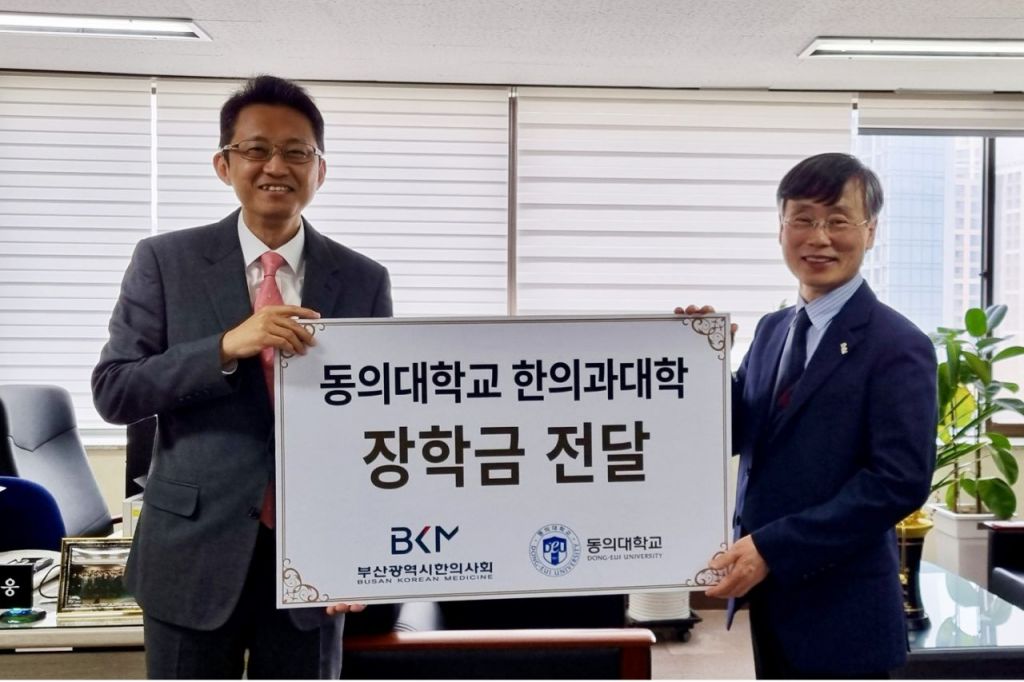 부산시 한의사회(회장 송상화)에서 동의대 한의과대학(학장 이해웅)에 재학생들의 학업 증진을 위한 장학금 500만원을 기탁했다.