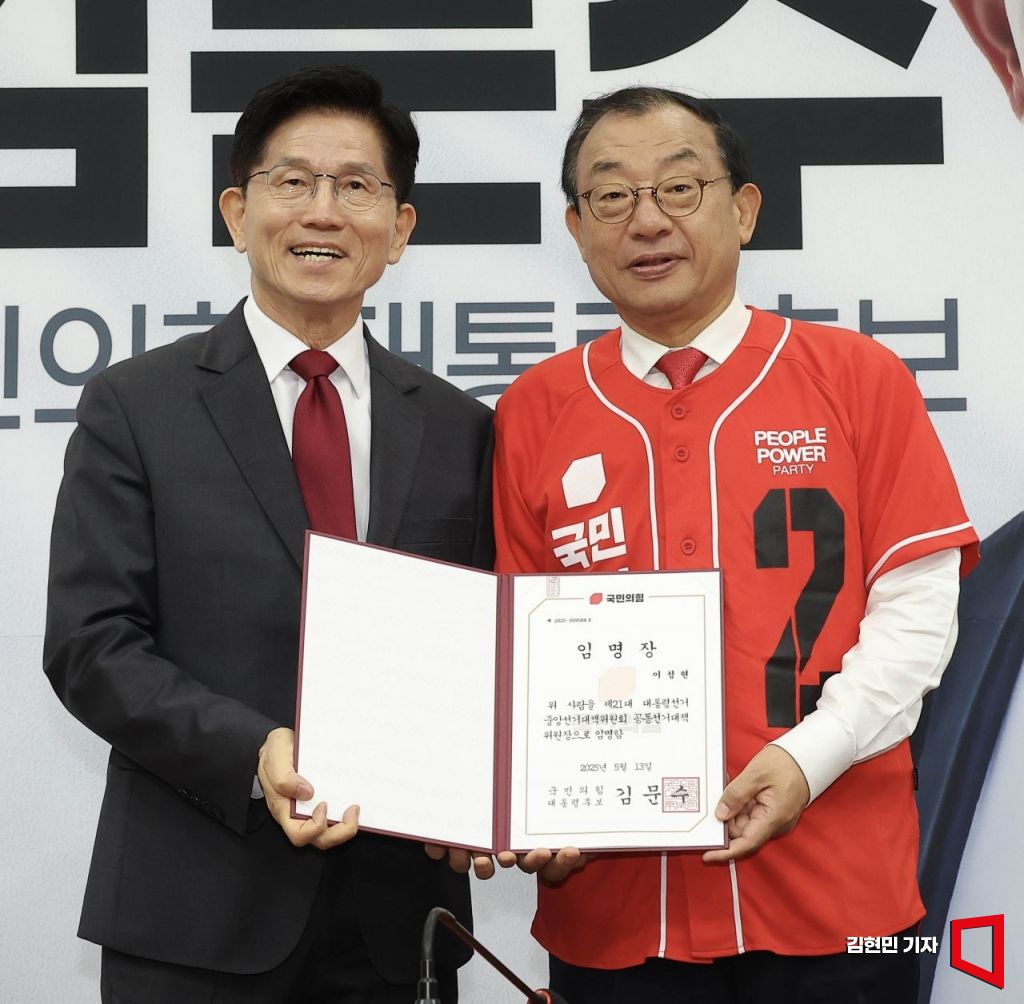 김문수 국민의힘 대선 후보가 15일 서울 여의도 국회에서 열린 중앙선대위 회의 및 중앙선대위 임명장 수여식에 이정현 공동선대위원장에게 임명장을 수여한 뒤 기념촬영을 하고 있다.