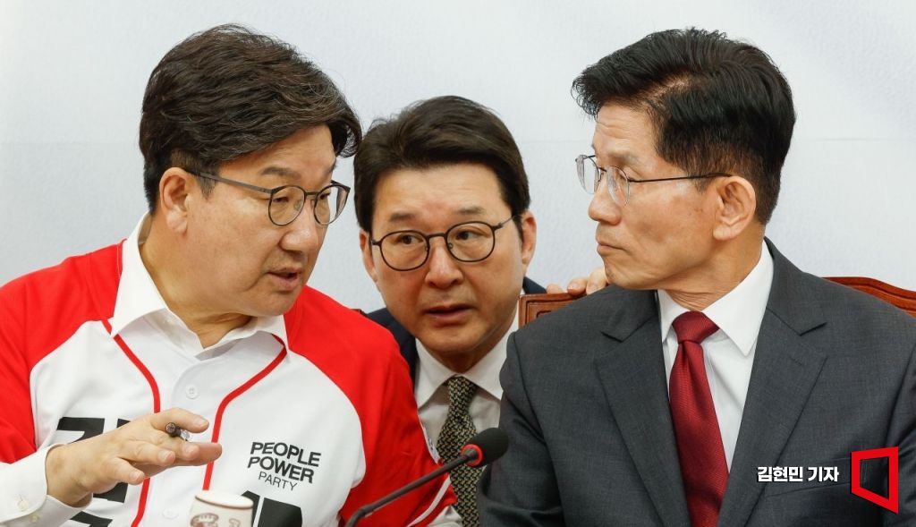 국민의힘 김문수 대선후보(오른쪽), 권성동 원내대표(왼쪽)가 15일 국회에서 열린 중앙선대위 회의 및 임명장 수여식에서 신동욱 대변인과 대화를 나누고 있다.