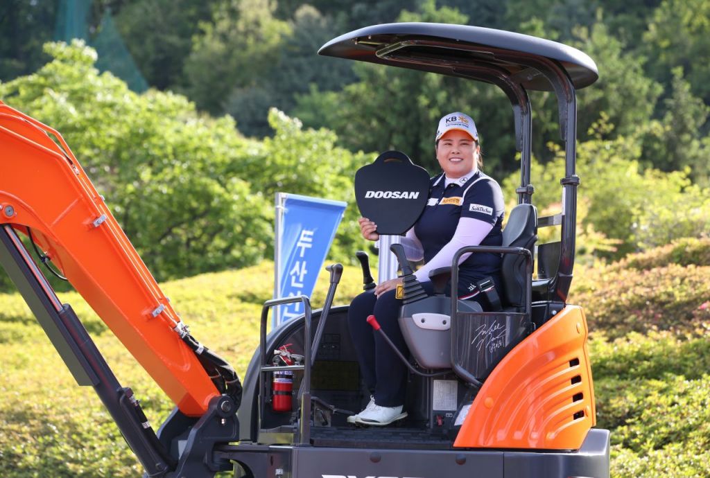 박인비가 2018년 두산 매치플레이 우승 직후 부상으로 받은 굴삭기에 앉아 환하게 웃고 있다. KLPGA