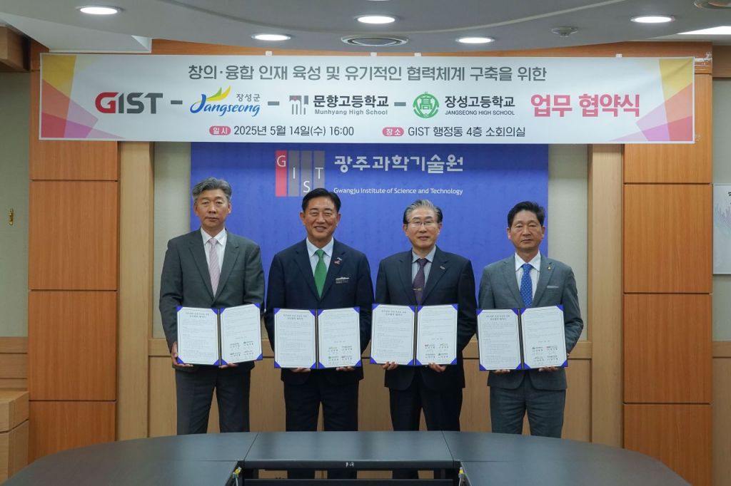 광주과학기술원(GIST)은 장성군, 문향고등학교, 장성고등학교와 함께 창의·융합 인재 양성과 협력 체계 구축을 위한 업무협약(MOU)을 체결했다고 15일 밝혔다.