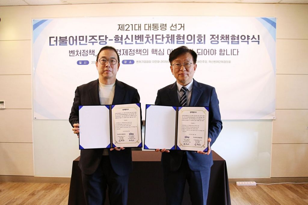 혁신벤처단체협의회(혁단협)는 15일 서울 구로구 벤처기업협회에서 더불어민주당 선거대책위원회 중소기업위원회와 '벤처스타트업 정책협약식'을 개최했다.