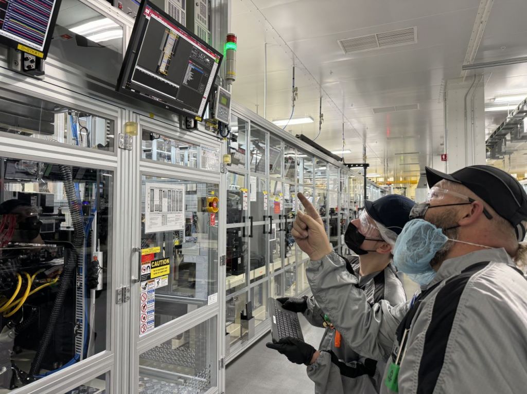 얼티엄셀즈 제2공장에서 현지 직원들이 배터리 생산 현황을 점검하고 있다. LG에너지솔루션 제공