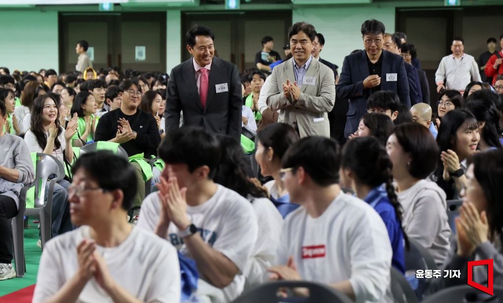 오세훈 서울시장이 15일 서울 성북구 고려대학교 화정체육관에서 열린 '서울시 사회복지관의 날' 행사에 참석하고 있다.